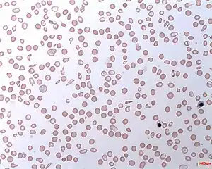Blood tests in PNH show changes consistent with intravascular hemolytic anemia: low hemoglobin, raised lactate dehydrogenase, raised bilirubin (a breakdown product of hemoglobin), and decreased levels of haptoglobin; there can be raised reticulocytes (immature red cells released by the bone marrow to replace the destroyed cells) if there is no iron deficiency present. The direct antiglobulin test (DAT, or direct Coombs' test) is negative, as the hemolysis of PNH is not caused by antibodies.[5] If the PNH occurs in the setting of known (or suspected) aplastic anemia, abnormal white blood cell counts and decreased platelet counts may be seen at this. In this case, anemia may be caused by insufficient red blood cell production in addition to the hemolysis.[5]