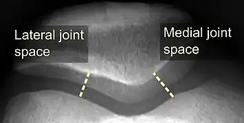 - The patellofemoral index is the ratio between the thickness of the medial joint space and the lateral joint space (L). With the knee 20° flexed, it should measure 1.6 or less.[16]