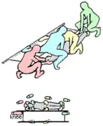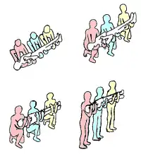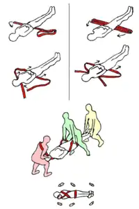 For this, two team members are placed on each side of the casualty; they place one hand under the buttock, the other under the opposite armpit; the casualty places their arms around the neck of the team members. A third team member lifts the legs as usual, and a fourth pushes the stretcher.