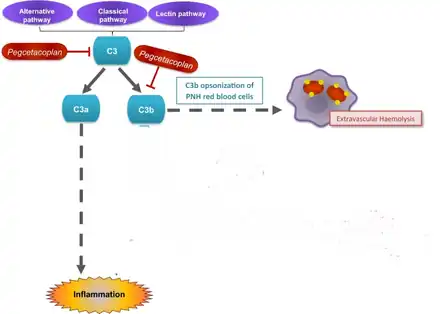 Pegcetacoplan is the first treatment for paroxysmal nocturnal hemoglobinuria that binds to and inhibits complement protein C3.[4]