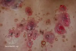 Blisters commonly erode and leave ulcerated lesions and erosions. A positive Nikolsky sign (induction of blistering in normal skin or at the edge of a blister) is indicative of the disease.[5]