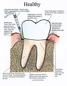 Periodontal charting refers to a chart utilized by a dental care professional (periodontist, dentist, registered dental hygienist) to write and record gingival[1] and overall oral conditions relating to oral and periodontal health or disease.