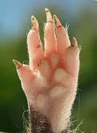The pes (Latin for foot) is the zoological term for the distal portion of the hind limb of tetrapod animals.[1] It is the part of the pentadactyl limb that includes the metatarsals and digits (phalanges). During evolution, it has taken many forms and served a variety of functions. It can be represented by the foot of primates, the lower hind limb of hoofed animals,[2] the lower portion of the leg of dinosaurs including birds or the rear paw. It is also represented in the rear 'paddle' of extinct marine reptiles, such as plesiosaurs. The oldest types of tetrapods had seven or eight digits.[1]