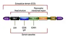 PfEMP1 is a large family of proteins having high molecular weights ranging from 200 to 350 kDa.[21] The wide range of molecular size reflects extreme variation in the amino acid composition of the proteins. But all the PfEMP1 proteins can be described as having three basic structural components, namely, an extracellular domain (ECD), a transmembrane domain (TMD) and an intracellular acidic terminal segment (ATS). The extracellular domain is fully exposed on the cell surface, and is the most variable region. It consists of a number of sub-domains, including a short and conserved N terminal segment (NTS) at the outermost region, followed by a highly variable Duffy-binding-like (DBL) domain, sometimes a Ca2+-binding C2 domain, and then one or two cysteine-rich interdomain regions (CIDRs).[9][22]