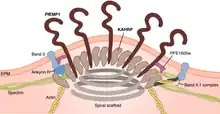 The PfEMP1 molecule is deposited at the RBC membrane at the knobs.[48] These knobs are easily identified as conspicuous bumps on the infected RBCs from the early trophozoite stage onward.[49] The malarial parasite cannot induce its virulence on RBCs without knobs.[50] As many as 10,000 knobs are distributed throughout the surface of a mature infected RBC, and each knob is 50-80 nm in diameter.[1] The export of pfEMP1 from Maurer's cleft to RBC membrane is mediated by binding of another protein produced by the parasite called knob-associated histidine-rich protein (KAHRP). KAHRP enhances the structural rigidity of infected RBC and adhesion of PfEMP1 on the knobs.[51] It is also directly responsible for forming knobs, as indicated by the fact that kahrp gene-deficient malarial parasites do not form knobs.[52] To form a knob, KAHRP aggregates several membrane skeletal proteins of the host RBC, such as spectrin, actin, ankyrin R, and spectrin–actin band 4.1 complex.[53] Upon arrival at the knob, PfEMP1 is attached to the spectrin network using the PHIST proteins.[54][36]