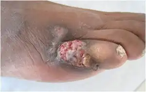 Phaeohyphomycosis is a fungal infection, caused by a range of dark filamentous fungi.[4][6] It can occur via entry through broken skin of wooden splinters or parts of plants, and typically affects skin of the arms and legs near the wrists and ankles.[2][3] It can be a single nodule or cyst just below the skin and it might look warty.[3] If breathed in, the fungus may cause an infection in the lungs.[5] Neurological symptoms occur with brain involvement.[2] It can appear as sinusitis with involvement of the paranasal sinuses.[4] It can be widespread.[5]