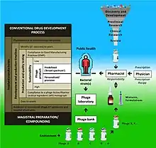 According to some, therapeutic phages should be prepared individually and kept in large phage banks, ready to be used, upon testing for effectiveness against the patient's bacterial pathogen(s). Intermediary or combined (industrially made as well as precision phage preparations) approaches could be appropriate.[129] However, it turns out to be difficult to reconcile classical phage therapy concepts, which are based on the timely adaptation of phage preparations, with current Western pharmaceutical R&D and marketing models. Repeated calls for a specific regulatory framework have not been heeded by European policymakers.[128] A phage therapy framework based on the Biological Master File concept has been proposed as a (European) solution to regulatory issues, but European regulations do not allow for an extension of this concept to biologically active substances such as phages.[130]