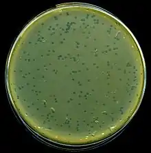 Phage typing is a phenotypic method that uses bacteriophages ("phages" for short) for detecting and identifying single strains of bacteria.[1] Phages are viruses that infect bacteria and may lead to bacterial cell lysis.[2] The bacterial strain is assigned a type based on its lysis pattern.[3] Phage typing was used to trace the source of infectious outbreaks throughout the 1900s, but it has been replaced by genotypic methods such as whole genome sequencing for epidemiological characterization.[1]