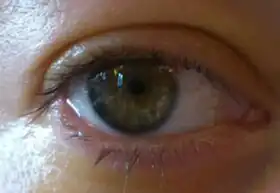 Photo of an eye after PIOL-implantation, 24 hours after surgery. The lens is visible in front of the iris; the pupil is still small due to presurgery eyedrops.