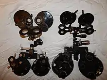 There were no cylindrical lenses, so testing for astigmatism required the use of manual trial-lenses, for which there were rotating holders on the front of each eye hole, and there were stationary ones on the backs as well. Cross-cylinders were optional, but they did not flip like a Jackson cross cylinder, they rotated in the same plane, so they were probably meant for the near point cross-cylinder test for reading.[7] It weighed 3 lb. 2 oz. Around 1920 an improved model, No. 574, was introduced, reduced in size but with the same range (lenses reduced from 1 inch to 3⁄4 inch). The forehead rest was removed, and the rear trial lens clips were replaced with rubber eye guards. It weighed 2 lbs. 12 oz.
