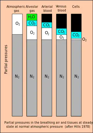 There is a metabolic reduction of total gas pressure in the tissues.[26] The sum of partial pressures of the gas that the diver breathes must necessarily balance with the sum of partial pressures in the lung gas. In the alveoli the gas has been humidified by a partial pressure of approximately 63 mbar (47 mmHg) and has gained about 55 mbar (41 mmHg) carbon dioxide from the venous blood. Oxygen has also diffused into the arterial blood, reducing the partial pressure of oxygen in the alveoli by about 67 mbar(50 mmHg) As the total pressure in the alveoli must balance with the ambient pressure, this dilution results in an effective partial pressure of nitrogen of about 758 mb (569 mmHg) in air at normal atmospheric pressure.[26]