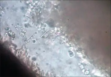 White piedra-KOH 10% wet mount of affected hairs showed septate hyaline hyphae arranged perpendicular to hair shaft | |