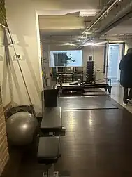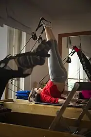 Pilates is continuously evolving through the use of modern equipment, but the core of the technique is tied to the movement patterns designed by Joseph Pilates.[5] Pilates can be performed on both a mat or on specialized equipment. Pilates often incorporates spring-based resistance machines known as reformers, which consists of a box-like frame, sliding platform, springs, straps/ropes, and pulleys that help support the spine and target different muscle groups.[12] For example, in order to target the upper back, a typical Pilates move on the reformer involves lying face-down on top of an accessory called a long box which is placed on top of the sliding platform. The participant then lifts their head and chest while pulling back the straps down toward their hips to slide forward with the moving platform and repeating a few times. The straps can be heavier or lighter depending on the resistance that is controlled by the springs.[20]