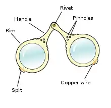 The earliest form of eyewear for which any archaeological record exists comes from the middle of the 15th century. It is a primitive pince-nez whose frames were made from two pieces of either metacarpal bone from the forelimb of a bull or large pieces of antler. The pieces were paddle-shaped, and joined by an iron rivet which provided the tension over the nose and allowed the lenses to be folded together. The purpose of the three holes at the place where the handle connects to the hinge is uncertain, though they may have been used for pinhole vision, a principle which was known from ancient times. Each paddle was split at one end to allow for the insertion of a lens, with the split closed by a piece of copper wire in normal use. The frames were extremely light, but the tension in the rivet would have loosened over time, making them unable to stay on the nose. Paintings depicting such frames date from as early as 1392 CE.[2]