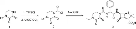 Piperacillin is a broad-spectrum β-lactam antibiotic of the ureidopenicillin class.[1] The chemical structure of piperacillin and other ureidopenicillins incorporates a polar side chain that enhances penetration into Gram-negative bacteria and reduces susceptibility to cleavage by Gram-negative beta lactamase enzymes. These properties confer activity against the important hospital pathogen Pseudomonas aeruginosa. Thus piperacillin is sometimes referred to as an "anti-pseudomonal penicillin".