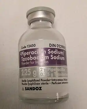 - ↑ Bryson HM, Brogden RN (March 1994). "Piperacillin/tazobactam. A review of its antibacterial activity, pharmacokinetic properties and therapeutic potential". Drugs. 47 (3): 506–35. doi:10.2165/00003495-199447030-00008. PMID 7514977. S2CID 209144038.