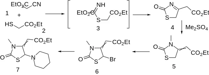 Condensation of ethyl mercaptoacetate with ethyl cyanoacetate leads to thiazolinone (4); an intermediate such as 3, involving addition of the mercaptide to the nitrile function can reasonably be invoked. M/ethylation with di(m)ethyl sulfate proceeds on nitrogen with the concomitant shift of the enamine to afford olefin (5). Bromination of the active methylene (6) followed by displacement of halogen by piperidine affords the choleretic piprozolin (7).