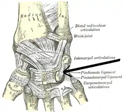 Ligaments of wrist. Anterior view. (Pisohamate ligament labeled at center right.)