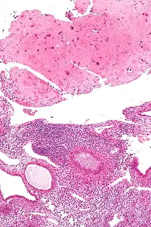 Micrograph of a placental site nodule (top of image). H&E stain. | |