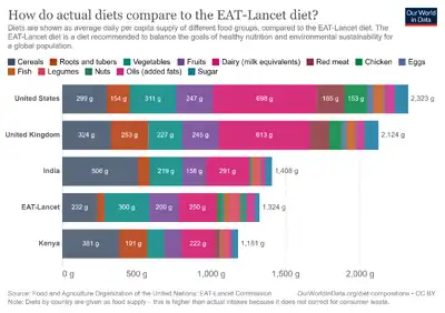 : CS1 maint: multiple names: authors list (link) - ↑ Manika Sharma, Avinash Kishore, Devesh Roy, Kuhu Joshi and Khiem Nguyen. (2020). "Indian Diets Fall Short of Eat-Lancet Reference Recommendations for Human and Planetary Health" Archived 2022-01-10 at the Wayback Machine. CGIAR Research Program on Agriculture for Nutrition and Health. Retrieved 22 November 2020.