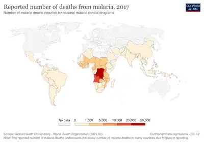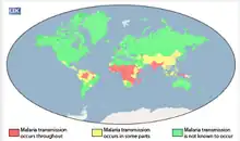P. malariae is the one of the least studied of the six species that infect humans, in part because of its low prevalence and milder clinical manifestations compared to the other species. It is widespread throughout sub-Saharan Africa, much of southeast Asia, Indonesia, on many of the islands of the western Pacific and in areas of the Amazon Basin of South America.[4] In endemic regions, prevalence ranges from less than 4% to more than 20%,[6] but there is evidence that P. malariae infections are vastly underreported.[7]