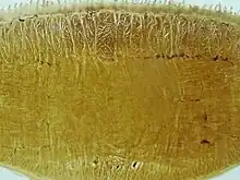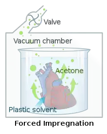 Other methods used in modern times include the Silicone S 10 Standard Procedure, the Cor-Tech Room temperature procedure, the Epoxy E 12 procedure, and the Polyester P 35 (P 40) procedure.[13] The Silicone S 10 is the procedure most often used in plastination and creates opaque, natural-looking specimen.[14] Dow Corning Corporation's Cor-Tech Room Temperature Procedure is designed to allow plastination of specimen at room temperature to various degrees of flexibility using three combinations of polymer, crosslinker, and catalyst.[15] According to the International Society for Plastination, the Epoxy E 12 procedure is used "for thin, transparent, and firm body and organ slices", while the Polyster P 35 (P 40) preserves "semitransparent and firm brain slices".[13] Samples are prepared for fixation through the first method by deep freezing,[16] while the second method works best following 4–6 weeks of preparation in a formaldehyde mixture.[17]