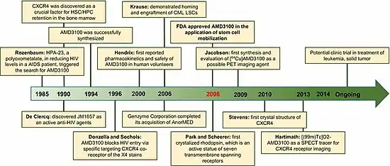 Then, it was serendipitously discovered by another chemist that such a molecule could have a potential use in the treatment of HIV because of its role in the blocking of CXCR4, a chemokine receptor which acts as a co-receptor for certain strains of HIV (along with the virus's main cellular receptor, CD4).[16]
