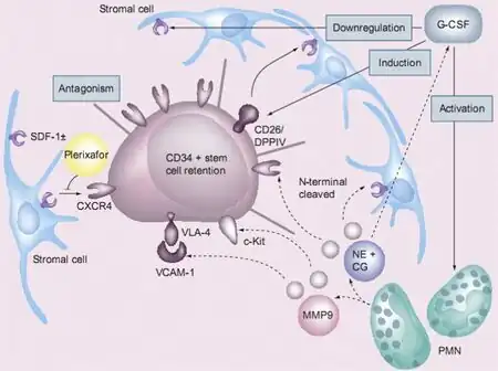 In the form of its zinc complex, plerixafor acts as an antagonist (or perhaps more accurately a partial agonist) of the alpha chemokine receptor CXCR4 and an allosteric agonist of CXCR7.[10] The CXCR4 alpha-chemokine receptor and one of its ligands, SDF-1, are important in hematopoietic stem cell homing to the bone marrow and in hematopoietic stem cell quiescence. The in vivo effect of plerixafor with regard to ubiquitin, the alternative endogenous ligand of CXCR4, is unknown. Plerixafor has been found to be a strong inducer of mobilization of hematopoietic stem cells from the bone marrow to the bloodstream as peripheral blood stem cells.[11] Additionally, plerixafor inhibits CD20 expression on B cells by interfering with CXCR4/SDF1 axis that regulates its expression.