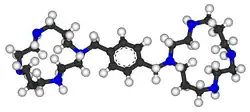 Plerixafor is a macrocyclic compound and a bicyclam derivative, the cyclam rings being linked at the amine nitrogen atoms by a 1,4-xylyl spacer.[5] It is a strong base; all eight nitrogen atoms accept protons readily. The two macrocyclic rings form chelate complexes with bivalent metal ions, especially zinc, copper and nickel, as well as cobalt and rhodium. The biologically active form of plerixafor is its zinc complex.[12]