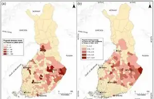 a) Human Pogosta disease cases registered in Finland during 2000–2019. b) average incidence of Pogosta disease per 1000 inhabitants over a 20-year period in Finland | |