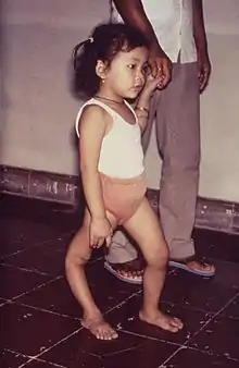 Residual complications of paralytic polio often occur following the initial recovery process.[12] Muscle paresis and paralysis can sometimes result in skeletal deformities, tightening of the joints, and movement disability. Once the muscles in the limb become flaccid, they may interfere with the function of other muscles. A typical manifestation of this problem is equinus foot (similar to club foot). This deformity develops when the muscles that pull the toes downward are working, but those that pull it upward are not, and the foot naturally tends to drop toward the ground. If the problem is left untreated, the Achilles tendons at the back of the foot retract and the foot cannot take on a normal position. Polio victims that develop equinus foot cannot walk properly because they cannot put their heel on the ground. A similar situation can develop if the arms become paralyzed.[71] In some cases the growth of an affected leg is slowed by polio, while the other leg continues to grow normally. The result is that one leg is shorter than the other and the person limps and leans to one side, in turn leading to deformities of the spine (such as scoliosis).[71] Osteoporosis and increased likelihood of bone fractures may occur. An intervention to prevent or lessen length disparity can be to perform an epiphysiodesis on the distal femoral and proximal tibial/fibular condyles, so that limb's growth is artificially stunted, and by the time of epiphyseal (growth) plate closure, the legs are more equal in length. Alternatively, a person can be fitted with custom made footwear which corrects the difference in leg lengths. Other surgery to re-balance muscular agonist/antagonist imbalances may also be helpful. Extended use of braces or wheelchairs may cause compression neuropathy, as well as a loss of proper function of the veins in the legs, due to pooling of blood in paralyzed lower limbs.[42][72] Complications from prolonged immobility involving the lungs, kidneys and heart include pulmonary edema, aspiration pneumonia, urinary tract infections, kidney stones, paralytic ileus, myocarditis and cor pulmonale.[42][72]