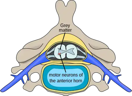 Spinal polio, the most common form of paralytic poliomyelitis, results from viral invasion of the motor neurons of the anterior horn cells, or the ventral (front) grey matter section in the spinal column, which are responsible for movement of the muscles, including those of the trunk, limbs, and the intercostal muscles.[13] Virus invasion causes inflammation of the nerve cells, leading to damage or destruction of motor neuron ganglia. When spinal neurons die, Wallerian degeneration takes place, leading to weakness of those muscles formerly innervated by the now-dead neurons.[39] With the destruction of nerve cells, the muscles no longer receive signals from the brain or spinal cord; without nerve stimulation, the muscles atrophy, becoming weak, floppy and poorly controlled, and finally completely paralyzed.[13] Maximum paralysis progresses rapidly (two to four days), and usually involves fever and muscle pain. Deep tendon reflexes are also affected, and are typically absent or diminished; sensation (the ability to feel) in the paralyzed limbs, however, is not affected.[40]