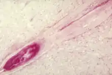 One mechanism involved in recovery is nerve terminal sprouting, in which remaining brainstem and spinal cord motor neurons develop new branches, or axonal sprouts.[67] These sprouts can reinnervate orphaned muscle fibers that have been denervated by acute polio infection,[68] restoring the fibers' capacity to contract and improving strength.[69] Terminal sprouting may generate a few significantly enlarged motor neurons doing work previously performed by as many as four or five units:[36] a single motor neuron that once controlled 200 muscle cells might control 800 to 1000 cells. Other mechanisms that occur during the rehabilitation phase, and contribute to muscle strength restoration, include myofiber hypertrophy – enlargement of muscle fibers through exercise and activity – and transformation of type II muscle fibers to type I muscle fibers.[68][70]