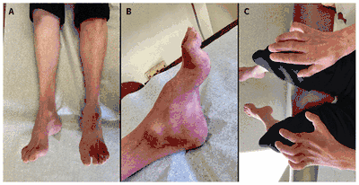 a) Atrophy of distal leg and foot musculature b) pes cavus , hammer toes c) severe atrophy of intrinsic hand muscles
