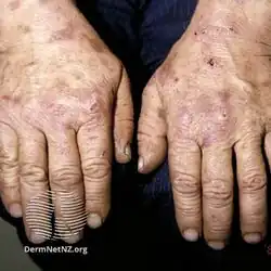 Porphyria cutanea tarda is a type of longterm porphyria characterized by burst blisters of fragile skin in areas that receive higher levels of exposure to sunlight, such as the face and backs of the hands.[1] There is frequently erosions, ulcers, darkened skin color and extra facial hair growth, and it heals slowly with scarring.[1] It may be associated with areas of thick skin, nail changes, hair loss and liver problems such as hepatitis C.[1]