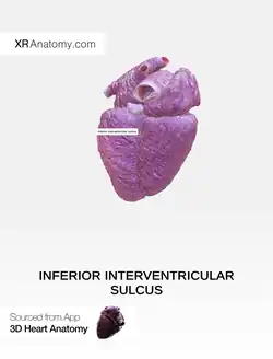 The posterior interventricular sulcus or posterior longitudinal sulcus is one of the two grooves separating the ventricles of the heart (the other being the anterior interventricular sulcus). They can be known as subsinosal interventricular groove or paraconal interventricular groove respectively. It is located on the diaphragmatic surface of the heart[1][2] near the right margin.[2] It extends between the coronary sulcus and the (notch of[2]) apex of the heart. It contains the posterior interventricular artery and middle cardiac vein.[1][2]