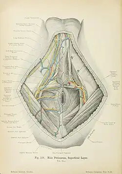 ![]() Posterior scrotal veins listed as "Posterior Scrotal Vessels" pointing at the blue vessel | |