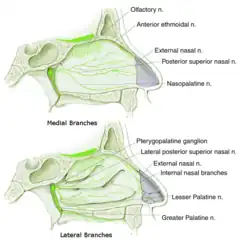 The nerve arises as a single trunk which split into 2-3 nerves within the pterygopalatine fossa.[1]: 496