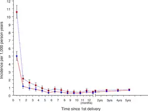 Various vascular disorders occasionally cause psychosis, especially cerebral venous thrombosis. Puerperal women are liable to thrombosis, especially thrombophlebitis of the leg and pelvic veins; aseptic thrombi can also form in the dural venous sinuses and the cerebral veins draining into them. Most patients present with headache, vomiting, seizures and focal signs such as hemiplegia or dysphasia, but a minority of cases have a psychiatric presentation.[49] The incidence is about 1 in 1,000 births in Europe and North America,[50] but much higher in India, where large series have been collected.[51] Psychosis is occasionally associated with other arterial or venous lesions: epidural anaesthesia can, if the dura is punctured, lead to leakage of cerebrospinal fluid and subdural haematoma.[52] Arterial occlusion may be due to thrombi, amniotic fragments or air embolism. Postpartum cerebral angiopathy is a transitory arterial spasm of medium caliber cerebral arteries; it was first described in cocaine and amphetamine addicts, but can also complicate ergot and bromocriptine prescribed to inhibit lactation. Subarachnoid haemorrhage can occur after miscarriage or childbirth. All these usually present with neurological symptoms, and occasionally with delirium.