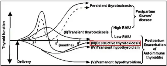 - ↑ Muller AF, Drexhage HA, Berghout A (October 2001). "Postpartum thyroiditis and autoimmune thyroiditis in women of childbearing age: recent insights and consequences for antenatal and postnatal care". Endocr. Rev. 22 (5): 605–30. doi:10.1210/edrv.22.5.0441. PMID 11588143.