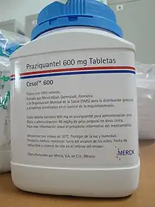 - ↑ "BILTRICIDE- praziquantel tablet, film coated (NDC Code(s): 50419-747-01)". DailyMed. July 2015. Archived from the original on 2015-09-10. Retrieved 2015-09-08.