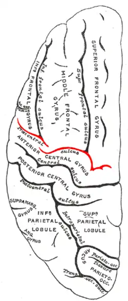 The precentral sulcus is a part of the human brain that lies parallel to, and in front of, the central sulcus.[1][2] A sulcus is one of the prominent grooves on the surface of the human brain.