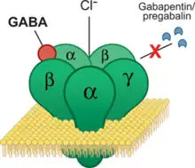 Pregabalin is a gabapentinoid and acts by inhibiting certain calcium channels.[19][20] Specifically it is a ligand of the auxiliary α2δ subunit site of certain voltage-dependent calcium channels (VDCCs), and thereby acts as an inhibitor of α2δ subunit-containing VDCCs.[19][66] There are two drug-binding α2δ subunits, α2δ-1 and α2δ-2, and pregabalin shows similar affinity for (and hence lack of selectivity between) these two sites.[19] Pregabalin is selective in its binding to the α2δ VDCC subunit.[66][67] Despite the fact that pregabalin is a GABA analogue,[68] it does not bind to the GABA receptors, does not convert into GABA or another GABA receptor agonist in vivo, and does not directly modulate GABA transport or metabolism.[20][66] However, pregabalin has been found to produce a dose-dependent increase in the brain expression of L-glutamic acid decarboxylase (GAD), the enzyme responsible for synthesizing GABA, and hence may have some indirect GABAergic effects by increasing GABA levels in the brain.[69][70][71] There is currently no evidence that the effects of pregabalin are mediated by any mechanism other than inhibition of α2δ-containing VDCCs.[66][72] In accordance, inhibition of α2δ-1-containing VDCCs by pregabalin appears to be responsible for its anticonvulsant, analgesic, and anxiolytic effects.[66][72]