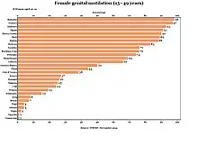 In a 2013 UNICEF report covering 29 countries in Africa and the Middle East, Egypt had the region's highest total number of women that have undergone FGM (27.2 million), while Somalia had the highest percentage (prevalence) of FGM (98%).[11]