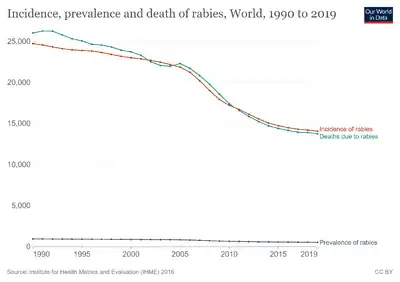 Historically, rabies was highly endemic in China, with few/inconsistent attempts to control transmission due to the lack of healthcare infrastructure. More than 5,200 deaths were reported annually during the period 1987 - 1989.[6] Infection is seasonal, with more cases reported during the spring and winter, with dogs being the most common animal vector.[7] The highest number of recorded cases was recorded in 1981, with 7037 human infections.[8] It was only until the 1990s did death rates decrease, as eradication efforts started being implemented on a nationwide level. The incidence of rabies decreased to fewer than 2000 cases per annum by 2011.[6] Despite this progress, rabies is still the fourth most common cause of death amongst category A and B infectious diseases Archived 2019-12-24 at the Wayback Machine, following HIV/AIDS, tuberculosis and viral hepatitis in 2018.[9]