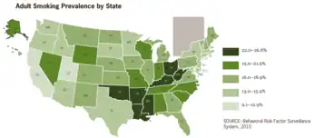There are large regional differences in smoking rates, with Kentucky, West Virginia, Oklahoma and Mississippi topping the list, and Idaho, California and Utah at significantly lower rates.[54]