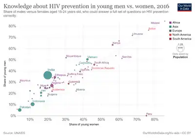 Studies conducted in sub-Saharan Africa have found that circumcision reduces the risk of HIV infection in heterosexual men between 38 and 66% over two years.[27] Based on these studies, the World Health Organization and UNAIDS both recommended male circumcision as a method of preventing female-to-male HIV transmission in 2007.[28] Whether it protects against male-to-female transmission is disputed[29][30] and whether it is of benefit in developed countries and among men who have sex with men is undetermined.[31][32][33] For men who have sex with men there is some evidence that the penetrative partner has a lower chance of contracting HIV.[34] Some experts fear that a lower perception of vulnerability among circumcised men may result in more sexual risk-taking behavior, thus negating its preventive effects.[35] Women who have undergone female genital cutting have an increased risk of HIV.[36]