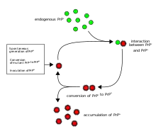 The first hypothesis that tried to explain how prions replicate in a protein-only manner was the heterodimer model.[50] This model assumed that a single PrPSc molecule binds to a single PrPC molecule and catalyzes its conversion into PrPSc. The two PrPSc molecules then come apart and can go on to convert more PrPC. However, a model of prion replication must explain both how prions propagate, and why their spontaneous appearance is so rare. Manfred Eigen showed that the heterodimer model requires PrPSc to be an extraordinarily effective catalyst, increasing the rate of the conversion reaction by a factor of around 1015.[51] This problem does not arise if PrPSc exists only in aggregated forms such as amyloid, where cooperativity may act as a barrier to spontaneous conversion. What is more, despite considerable effort, infectious monomeric PrPSc has never been isolated.