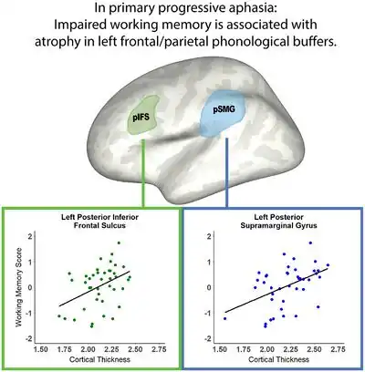 - ↑ Harciarek M, Kertesz A (September 2011). "Primary progressive aphasias and their contribution to the contemporary knowledge about the brain-language relationship". Neuropsychol Rev. 21 (3): 271–87. doi:10.1007/s11065-011-9175-9. PMC 3158975. PMID 21809067.
