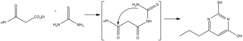 Propylthiouracil can be prepared from ethyl 3-oxohexanoate and thiourea.[15]